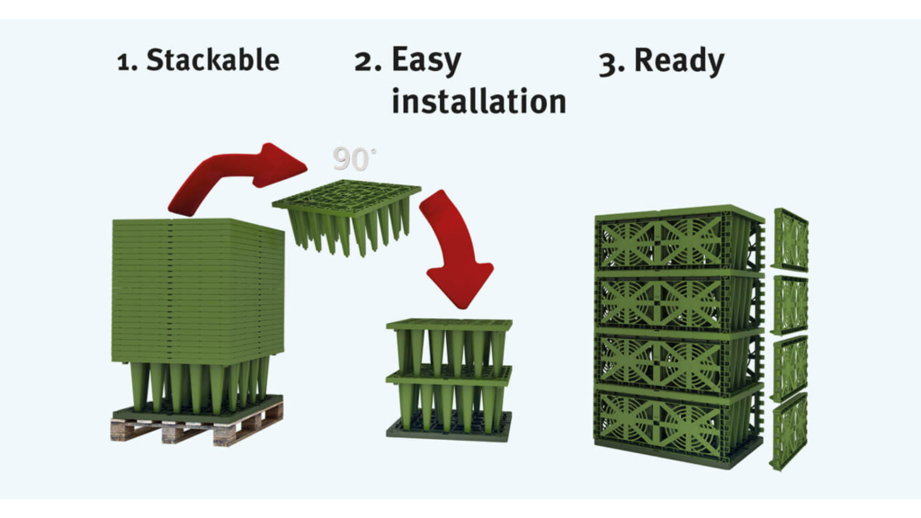 The lightweight and stackable design allows for quick and straightforward installation with standard equipment. This modularity reduces labor time and costs while providing flexibility for various site configurations.
